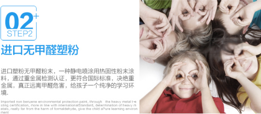 2、進口塑粉無甲醛粉末,一種靜電噴涂用熱固性粉末涂料,通過重金屬檢測認證,更符合國標標準,決絕重金屬,真正遠離甲醛危害,給孩子一個純凈的學習環(huán)境。